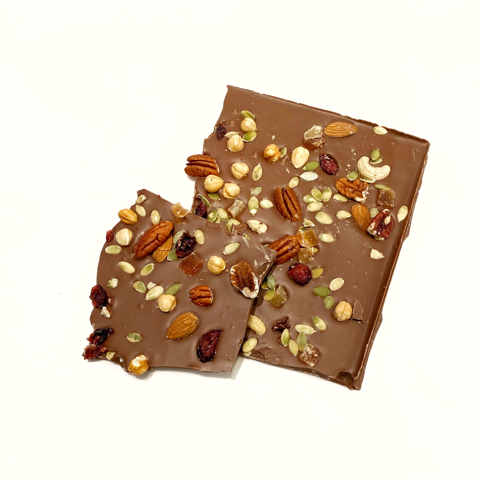 Délicieux morceaux de chocolat au lait avec graines de citrouille, noix, graines et fruits secs.